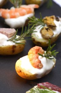 Garnir la moitié des pommes de terre avec l’appareil aux algues et rajouter crevette, moule, thon fumé, saumon et langoustine.