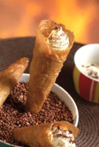 Tailler les feuilles de brick en quatre, les beurrer, puis sucrer. Réaliser des cônes, les cuire 5 min.
