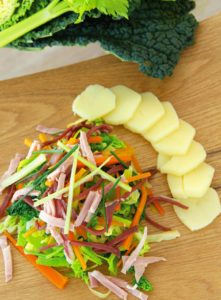 Rajouter le magret de canard fumé et le jambon blanc coupés en julienne. Incorporer à la poêle. Faire sauter. Déguster chaud.
