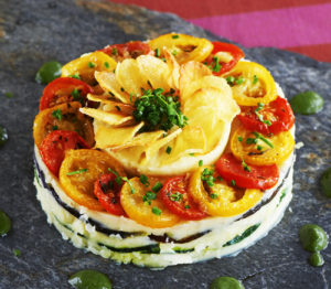 Remettre tous les ingrédients en température. Dans un cercle, alterner une couche de courgettes, une couche de purée, une couche d’aubergines, une couche de purée et terminer par les tranches de tomates cerise séchées. Dresser une rosace de chips de pommes de terre au centre, ajouter le pesto autour du parmentier.