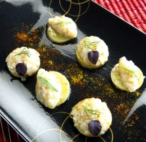 Tartare de Saint Jacques : couper les noix en petits dés. Ajouter le reste de la marinade, assaisonner. Réaliser une quenelle de tartare, à l’aide de deux cuillères à café, et la poser sur une lamelle de pomme de terre. Décorer avec les herbes.