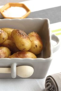 Mettre le beurre et les pommes de terre dans une plaque à rôtir et enfourner pendant 40 à 45 min. Toutes les 15 min, arroser les pommes de terre avec le jus de cuisson pour qu’elles dorent.