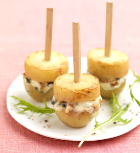 Répartissez un peu de préparation aux noix et au fromage entre les morceaux de chaque moitié de pomme de terre, piquez les deux morceaux de pomme de terre d’une pique en bois.