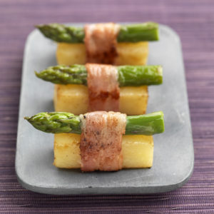 Déposez une asperge sur chaque pomme de terre puis enroulez le tout d’une tranche de lard. Faites dorer les sushis dans le reste du beurre sur toutes les faces. Servez aussitôt.