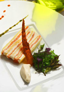 Laisser au frais 3 h dans le compartiment le plus frais du réfrigérateur. Démouler la terrine et trancher délicatement à l’aide d’un couteau régulièrement trempé dans l’eau.