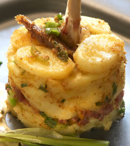 Prendre un emporte pièce d’un diamètre d’environ 12 cm (moule sans fond) et y déposer la préparation en tassant un peu de façon à pouvoir le démouler. Planter l’os de la cuisse dedans comme sur la photo. Mettre sur une assiette. Servir bien chaud avec une salade verte.