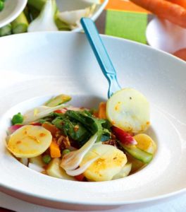- vinaigrette : huile de pépin de raisin, vinaigre de cidre, échalote finement hachée, 1 cuillère de moutarde de Meaux, sel et poivre