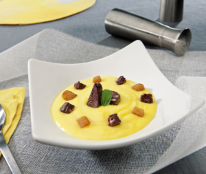 Dans une assiette creuse, verser le velouté, puis servir avec le boudin et les pommes.